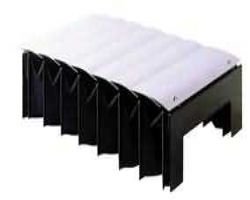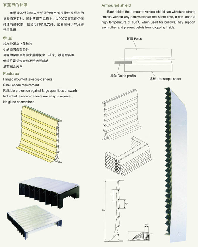 盔甲式防護罩罩面為鋼板,罩身形似風琴式防護罩。每個折層能經(jīng)受強烈的振動而不變形,同時應用在風箱上,以900℃高溫而仍保持原有的狀態(tài),他們之間彼此支持,起著阻礙小碎片滲透的作用。