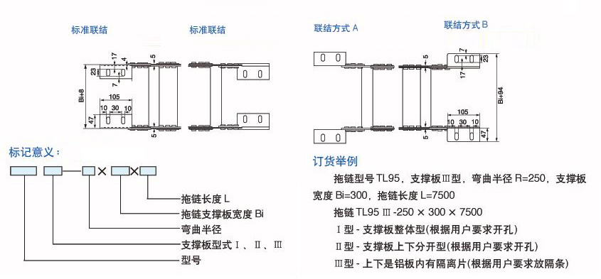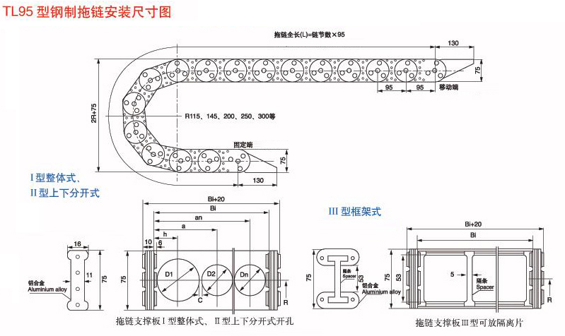 TL95系列拖鏈的主體是由鏈板(優(yōu)質(zhì)鋼板鍍鉻)支撐板(擠拉鋁合金)軸銷(合金鋼)等部件組成,使電纜或橡膠管與拖鏈之間不產(chǎn)生相對(duì)運(yùn)動(dòng),不產(chǎn)生扭曲變形,鏈板經(jīng)鍍鉻處理外形效果新穎,結(jié)構(gòu)合理,靈巧強(qiáng)度高,鋼性好不變形,安裝方便,使用可靠,易拆裝,尤其是本產(chǎn)品采用了高強(qiáng)度耐磨材料,合金為軸銷,提高了產(chǎn)品的耐磨強(qiáng)度,彎曲更靈活,阻力更小,降低了噪音,從而可保證長(zhǎng)時(shí)間不變形,不下垂。 |