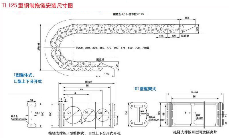 TL125系列拖鏈的主體是由鏈板(優(yōu)質(zhì)鋼板鍍鉻)支撐板(擠拉鋁合金)軸銷(合金鋼)等部件組成,使電纜或橡膠管與拖鏈之間不產(chǎn)生相對(duì)運(yùn)動(dòng),不產(chǎn)生扭曲變形,鏈板經(jīng)鍍鉻處理外形效果新穎,結(jié)構(gòu)合理,靈巧強(qiáng)度高,鋼性好不變形,安裝方便,使用可靠,易拆裝,尤其是本產(chǎn)品采用了高強(qiáng)度耐磨材料,合金為軸銷,提高了產(chǎn)品的耐磨強(qiáng)度,彎曲更靈活,阻力更小,降低了噪音,從而可保證長(zhǎng)時(shí)間不變形,不下垂。 |
