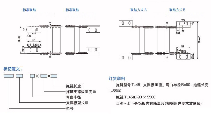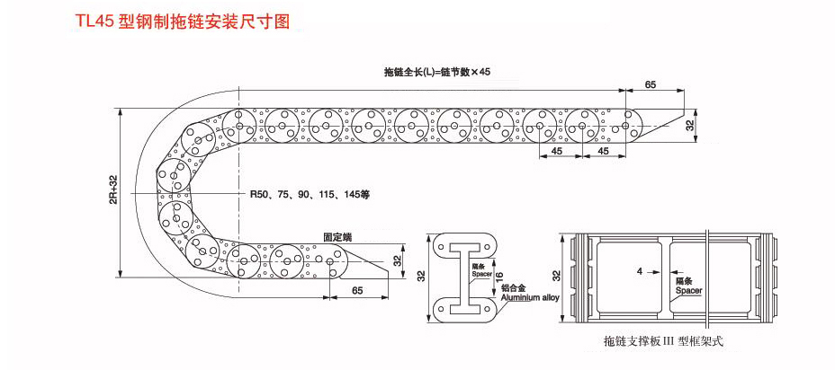 TL系列拖鏈的主體是由鏈板(優(yōu)質(zhì)鋼板鍍鉻)支撐板(擠拉鋁合金)軸銷(合金鋼)等部件組成,使電纜或橡膠管與拖鏈之間不產(chǎn)生相對運(yùn)動(dòng),不產(chǎn)生扭曲變形,鏈板經(jīng)鍍鉻處理外形效果新穎,結(jié)構(gòu)合理,靈巧強(qiáng)度高,鋼性好不變形,安裝方便,使用可靠,易拆裝,尤其是本產(chǎn)品采用了高強(qiáng)度耐磨材料,合金為軸銷,提高了產(chǎn)品的耐磨強(qiáng)度,彎曲更靈活,阻力更小,降低了噪音,從而可保證長時(shí)間不變形,不下垂。 |